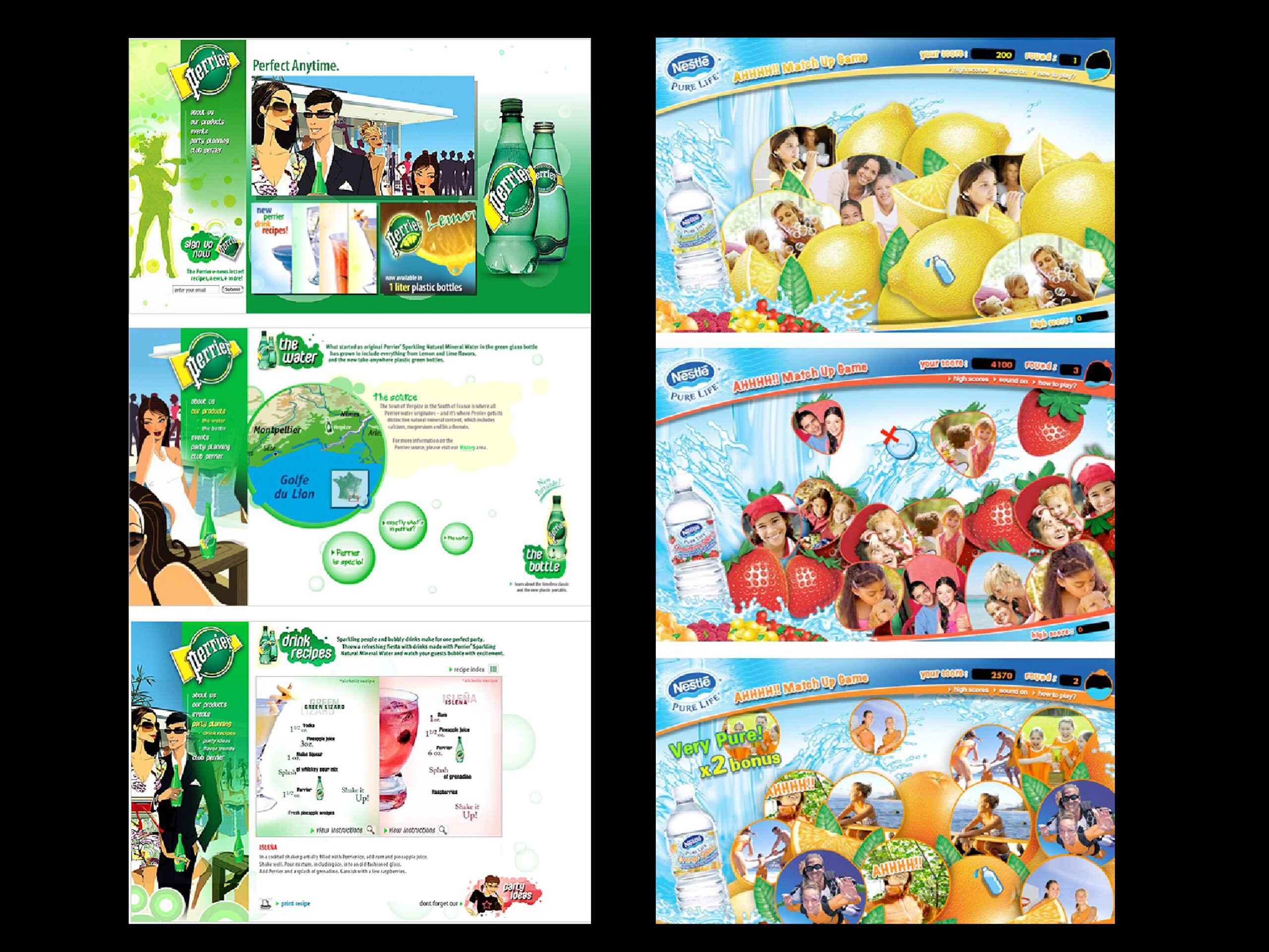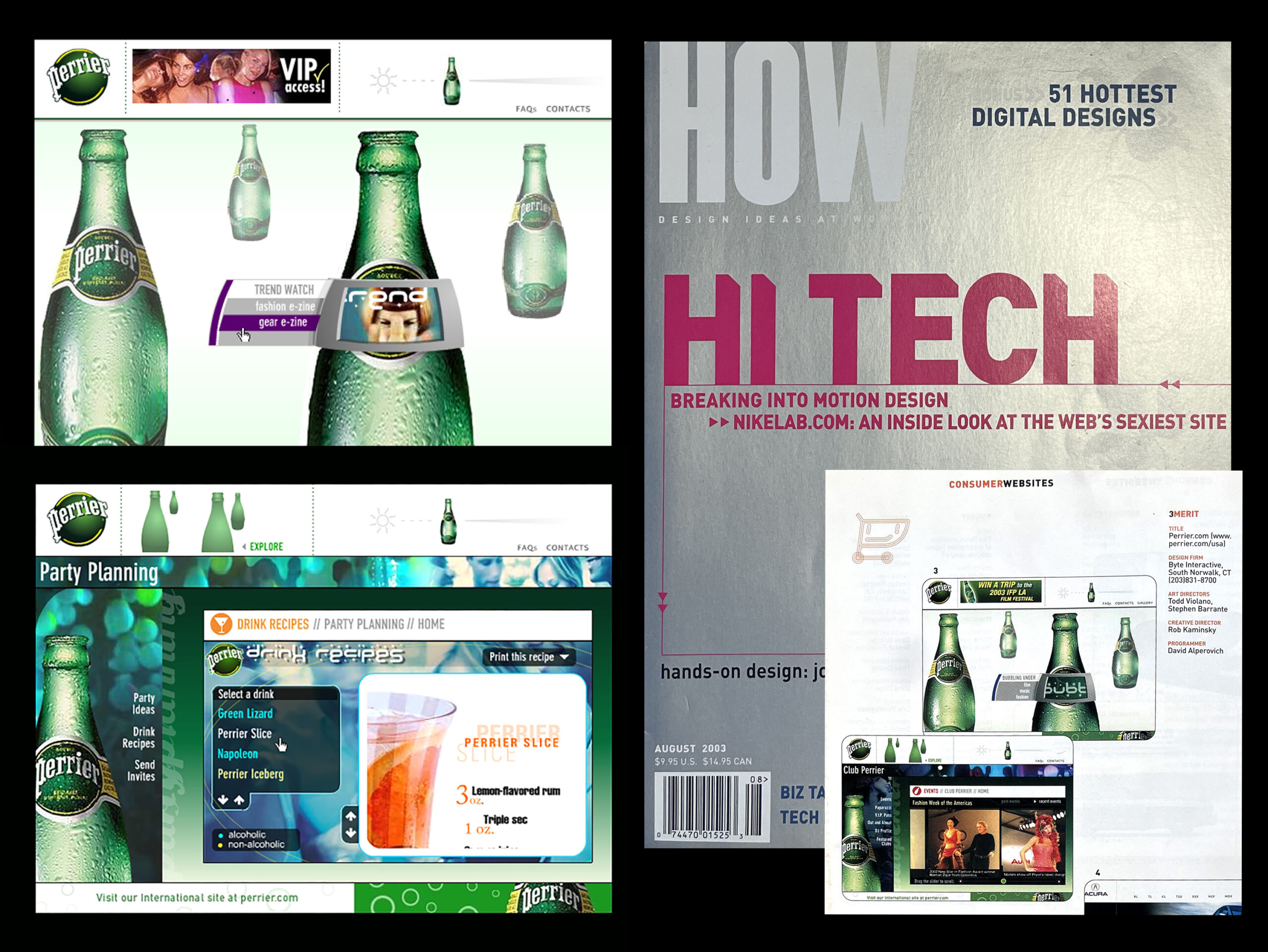 Perrier featured in HOW’s hottest websites. A “fizz-ier” website gaming engine was created to pass along the latest funniest sites. A matching game for Nestle Water was created to promote the brand.